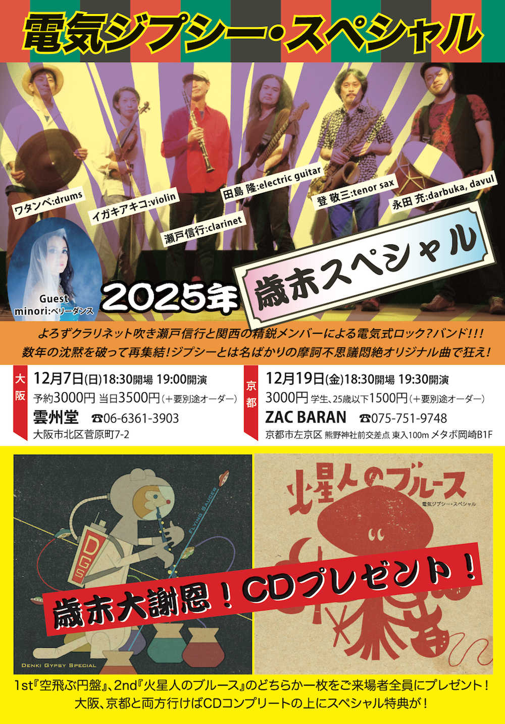 なんとCD付きライブ!1st『空飛ぶ円盤』2nd『火星人のブルース』のどちらか一枚をご来場者全員にプレゼント!さらに!12/19の京都ライブと両方行けばCDコンプリートの上にスペシャルなオマケが!